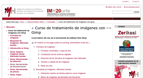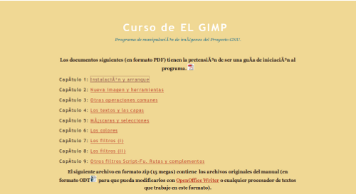 Completo curso de Gimp del Ministerio de Educación compuesto por 11 unidades y un taller práctico. Incluye prácticas guiadas y ejercicios propuestos así como la opción a descargar una versión PDF de las unidades.