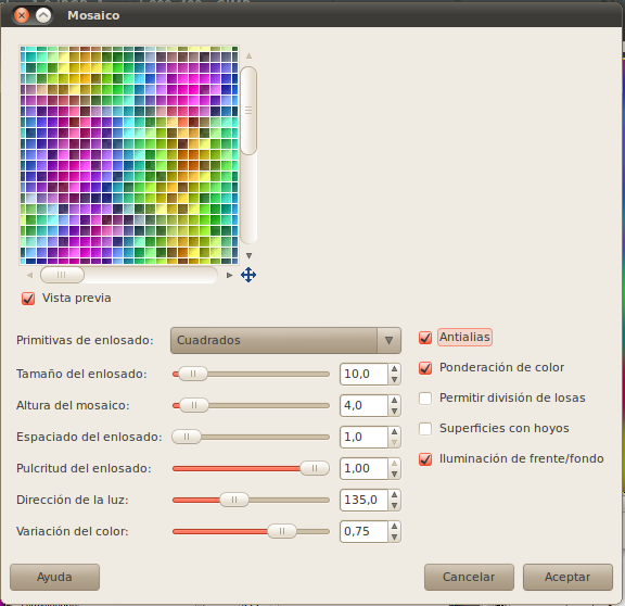 Utiliza los valores indicados en la imagen. Recuerda en deshabilitar la opción "Permitir división de losas" en la parte derecha del diálogo del filtro. Puedes utilizar otras variaciones del mosaico de las especificadas para obtener otros resultados interesantes.
