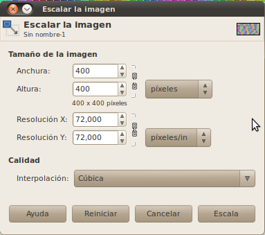 Ejecuta la opción de menú "Imagen -> Escalar la imagen...". Debemos de generar una imagen cuadrada, por lo tanto el ancho y el alto deben de tener las mismas dimensiones (recuerda desactivar la cadena junto a los cuadros de texto para ello).