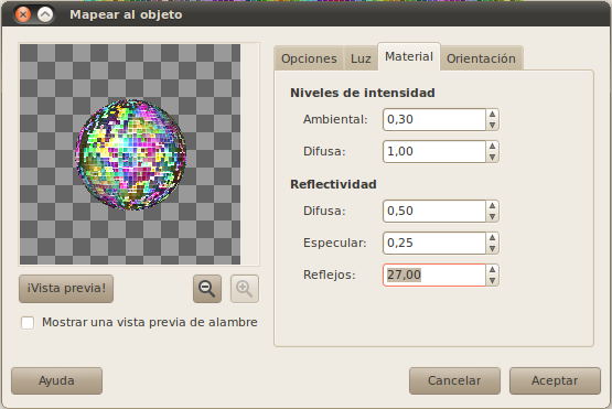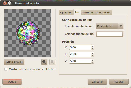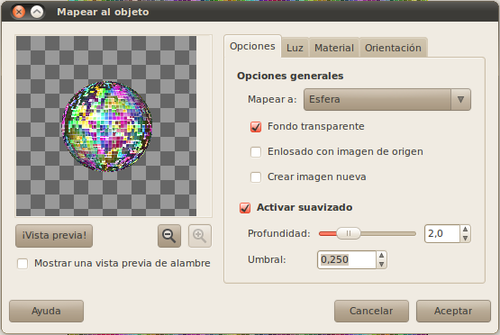 Llegamos a un paso importante del tutorial. Para ello utilizaremos la opción de menú "Filtros -> Mapa -> Mapear objeto...". Lo principal es mapear la imagen a una esfera, utiliza los siguientes valores en las diferentes pestañas del diálogo de mapeado.