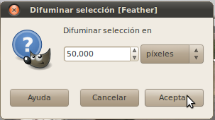 Difuminamos la selección mediante la opción de menú "Seleccionar -> Difuminar [Feather]". Indicamos un valor de 50 pixeles, aunque este valor dependerá del tamaño de la imagen utilizada.