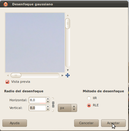 Aplicamos el filtro "Filtros -> Desenfoque [Blur] -> Desenfoque Gaussiano]". Utilizamos un radio de desenfoque de 8 pixeles.