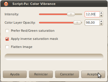El último paso consiste en ajustar el color, para ello vamos a utilizar un script que genera todo el proceso automaticamente. Descargad el script de color vibrance de gimp.org y copiadlo en la carpeta scripts de vuestra instalación de Gimp. Una vez reiniciado el programa y si no ha habido ningún problema debe de aparecer la opción de menú "Filtros -> Eg -> Color Vibrance". Ejecutamos la opción indicada y debe de aparecer el siguiente diálogo: