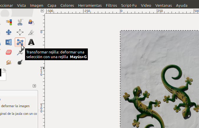 Una vez creada la rejilla ahora sólo debemos seleccionar grupos de puntos y desplazarlos. Gimp recalculará de forma automática la forma de la imagen.